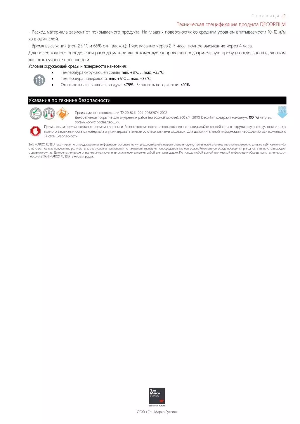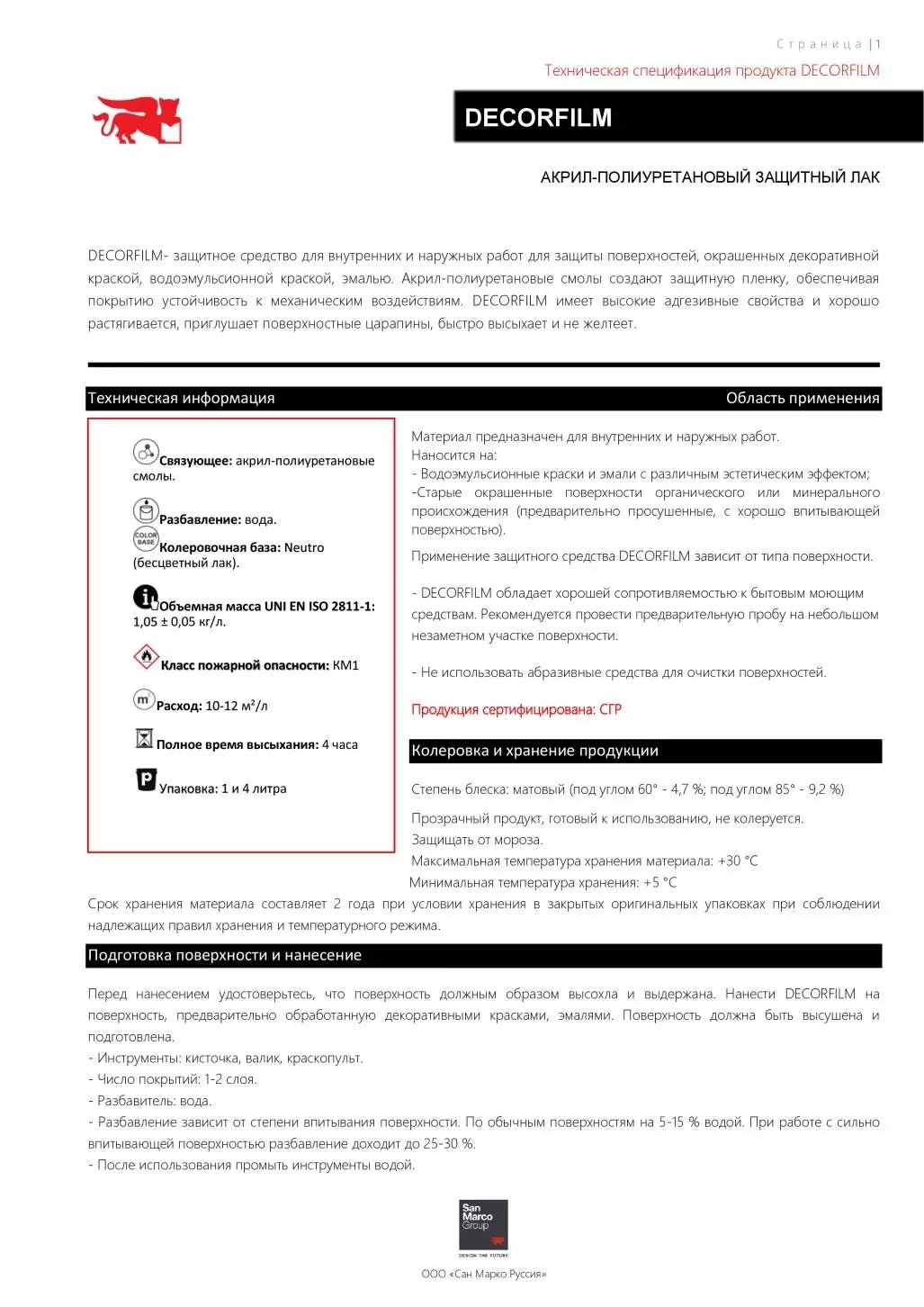 Перед нанесением удостоверьтесь, что поверхность должным образом высохла и выдержана. Нанести DECORFILM на поверхность, предварительно обработанную декоративными красками, эмалями. Поверхность должна быть высушена и подготовлена. - Инструменты: кисточка, валик, краскопульт. - Число покрытий: 1-2 слоя. - Разбавитель: вода. - Разбавление зависит от степени впитывания поверхности. По обычным поверхностям на 5-15 % водой. При работе с сильно впитывающей поверхностью разбавление доходит до 25-30%. - После использования промыть инструменты водой.