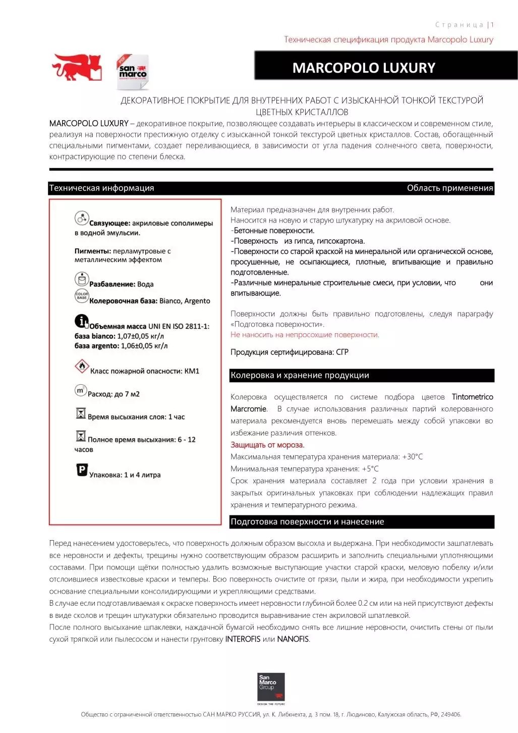 MARCOPOLO LUXURY – декоративное покрытие, позволяющее создавать интерьеры в классическом и современном стиле, реализуя на поверхности престижную отделку с изысканной тонкой текстурой цветных кристаллов. Состав, обогащенный специальными пигментами, создает переливающиеся, в зависимости от угла падения солнечного света, поверхности, контрастирующие по степени блеска.