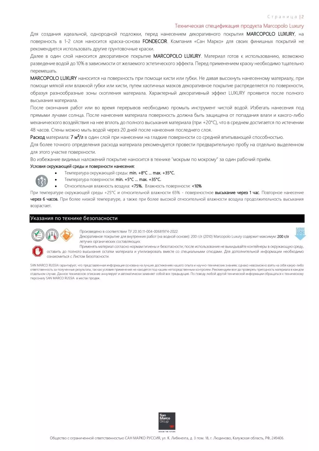 Для создания идеальной, однородной подложки, перед нанесением декоративного покрытия MARCOPOLO LUXURY, на поверхность в 1-2 слоя наносится краска-основа FONDECOR. Компания «Сан Марко» для своих финишных покрытий не рекомендуется использовать другие грунтовочные краски. Далее в один слой наносится декоративное покрытие MARCOPOLO LUXURY. Материал готов к использованию, возможно разведение водой до 10% в зависимости от желаемого эстетического эффекта. Перед применением краску необходимо тщательно перемешать. MARCOPOLO LUXURY наносится на поверхность при помощи кисти или губки. Не давая высохнуть нанесенному материалу, при помощи мягкой или влажной губки или кисти, путем хаотичных мазков декоративное покрытие распределяется по поверхности, образуя разнообразные зоны скопления материала. Характерный декоративный эффект LUXURY проявится после полного высыхания материала. После окончания работ или во время перерывов необходимо промыть инструмент чистой водой. Избегать нанесения под прямыми лучами солнца. После нанесения материала поверхность должна быть защищена от попадания влаги и какого-либо механического воздействия на нее вплоть до полного высыхания материала (при +20°C), что в среднем достигается по истечении 48 часов. Стены можно мыть водой через 20 дней после нанесения последнего слоя.