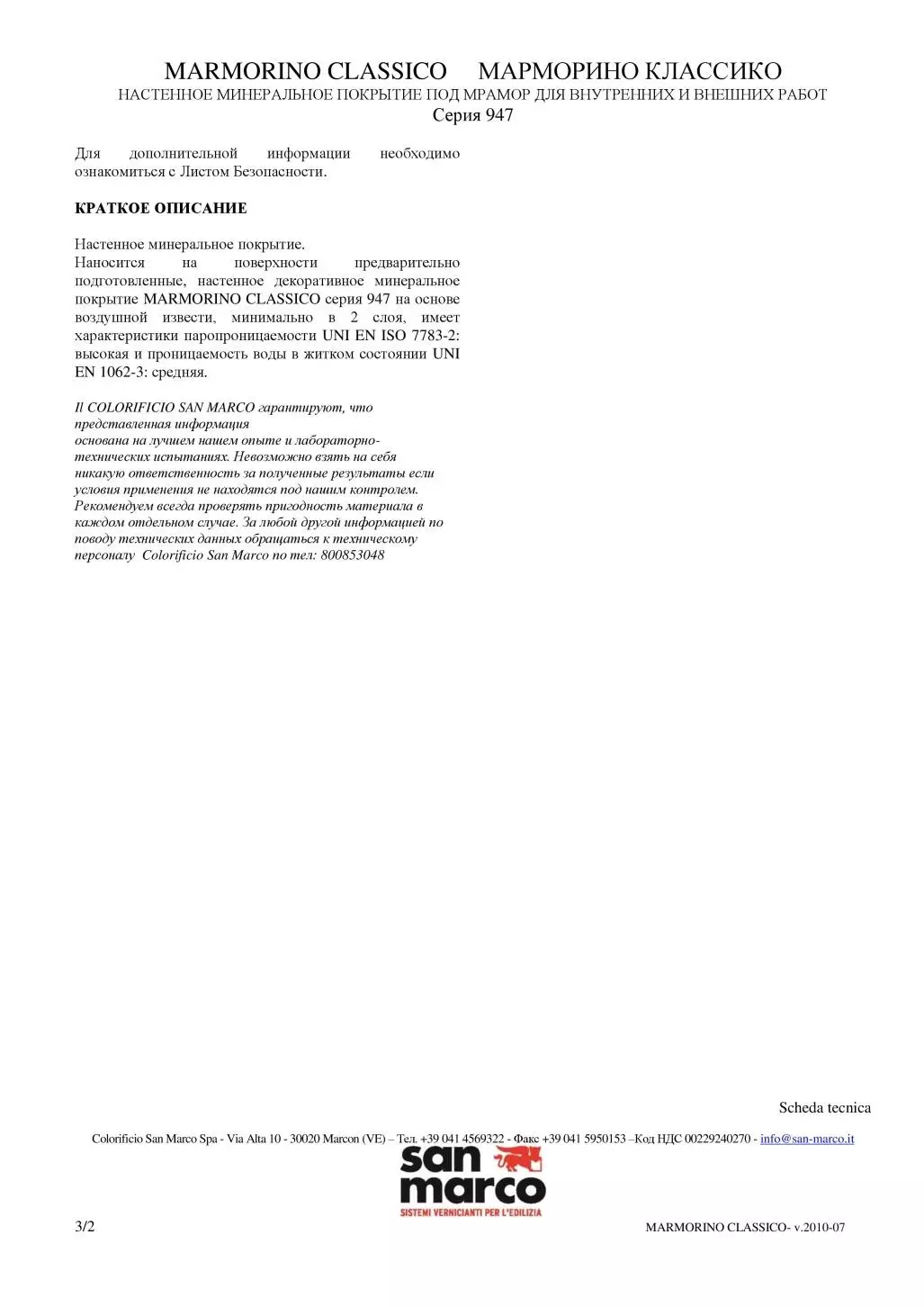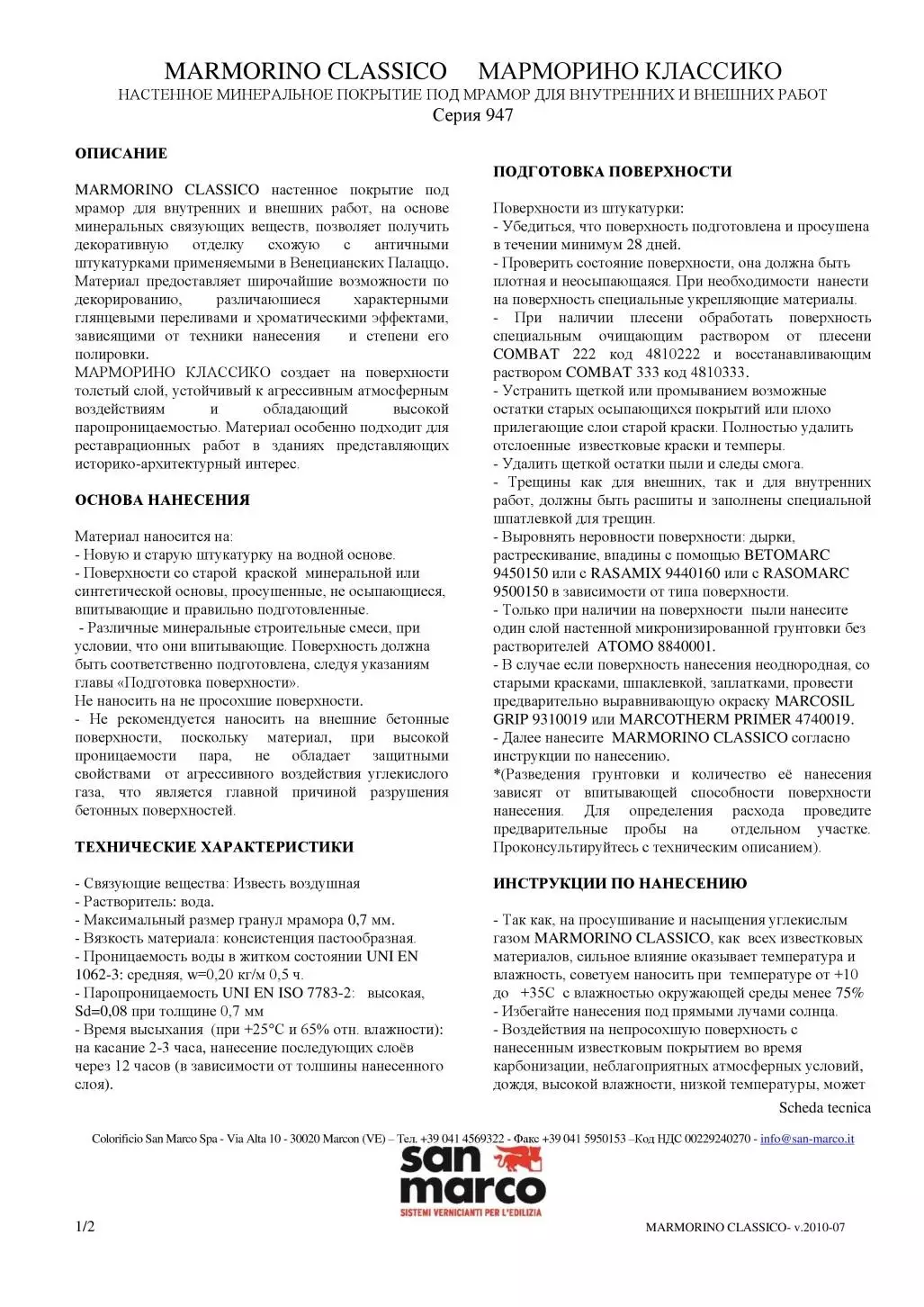 MARMORINO CLASSICO настенное покрытие под мрамор для внутренних и внешних работ, на основе минеральных связующих веществ, позволяет получить декоративную отделку схожую с античными штукатурками применяемыми в Венецианских Палаццо. Материал предоставляет широчайшие возможности по декорированию, различающиеся характерными глянцевыми переливами и хроматическими эффектами, зависящими от техники нанесения и степени его полировки. МАРМОРИНО КЛАССИКО создает на поверхности толстый слой, устойчивый к агрессивным атмосферным воздействиям и обладающий высокой паропроницаемостью. Материал особенно подходит для реставрационных работ в зданиях представляющих историко-архитектурный интерес.