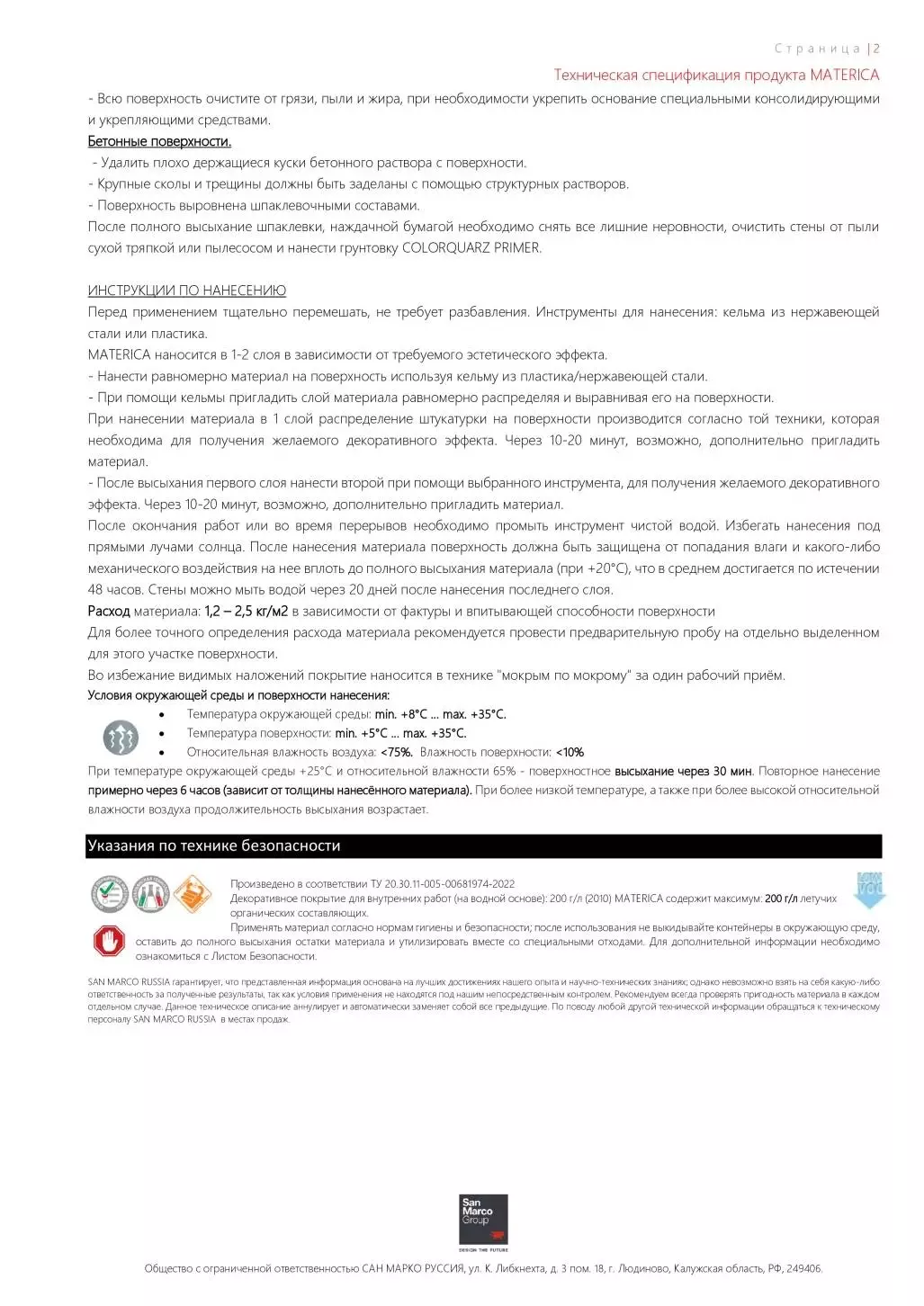 Расход материала: 1,2 – 2,5 кг/м2 в зависимости от фактуры и впитывающей способности поверхности Для более точного определения расхода материала рекомендуется провести предварительную пробу на отдельно выделенном для этого участке поверхности. Во избежание видимых наложений покрытие наносится в технике "мокрым по мокрому" за один рабочий приём.