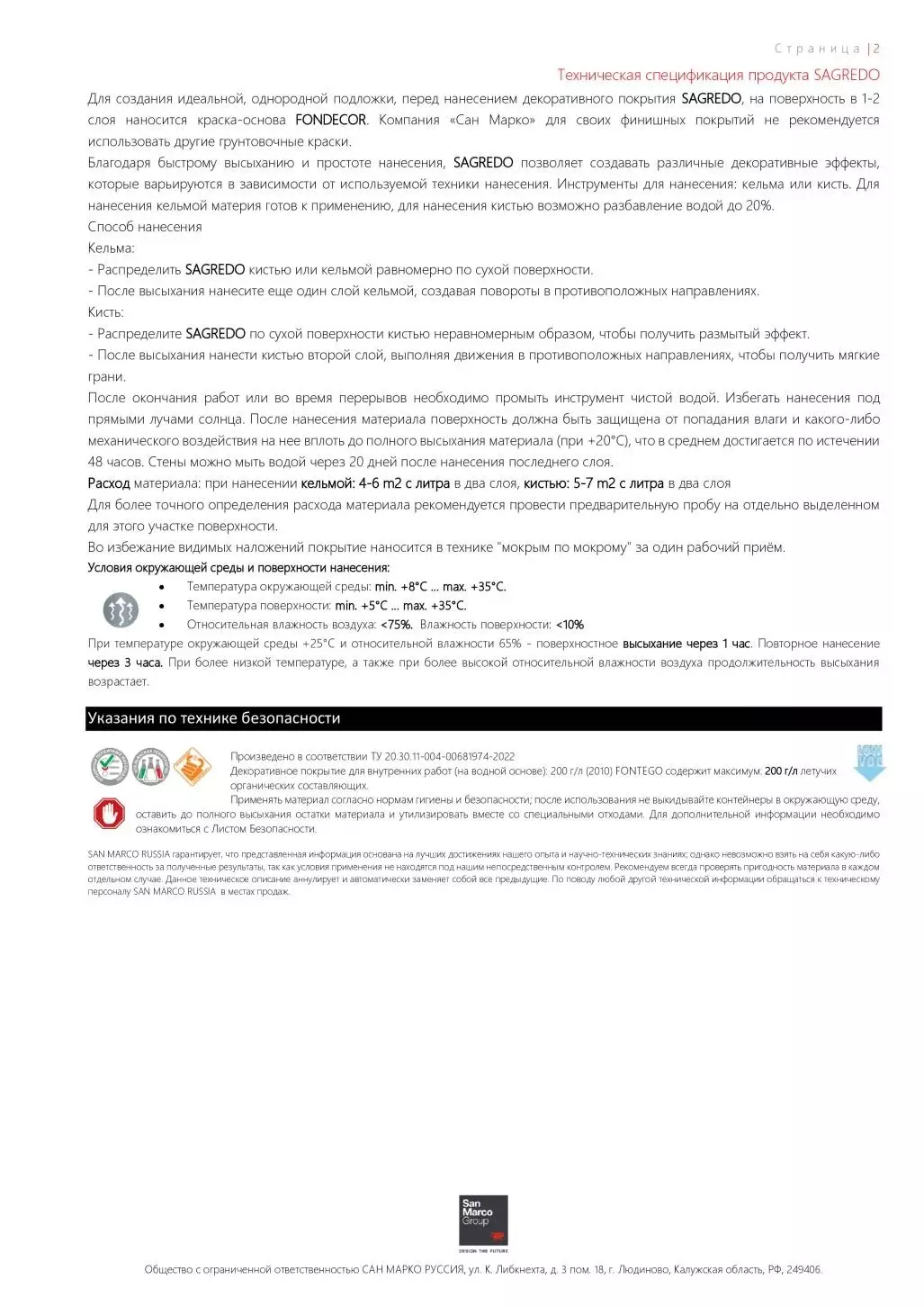 Для создания идеальной, однородной подложки, перед нанесением декоративного покрытия SAGREDO, на поверхность в 1-2 слоя наносится краска-основа FONDECOR. Компания «Сан Марко» для своих финишных покрытий не рекомендуется использовать другие грунтовочные краски. Благодаря быстрому высыханию и простоте нанесения, SAGREDO позволяет создавать различные декоративные эффекты, которые варьируются в зависимости от используемой техники нанесения. Инструменты для нанесения: кельма или кисть. Для нанесения кельмой материя готов к применению, для нанесения кистью возможно разбавление водой до 20%.