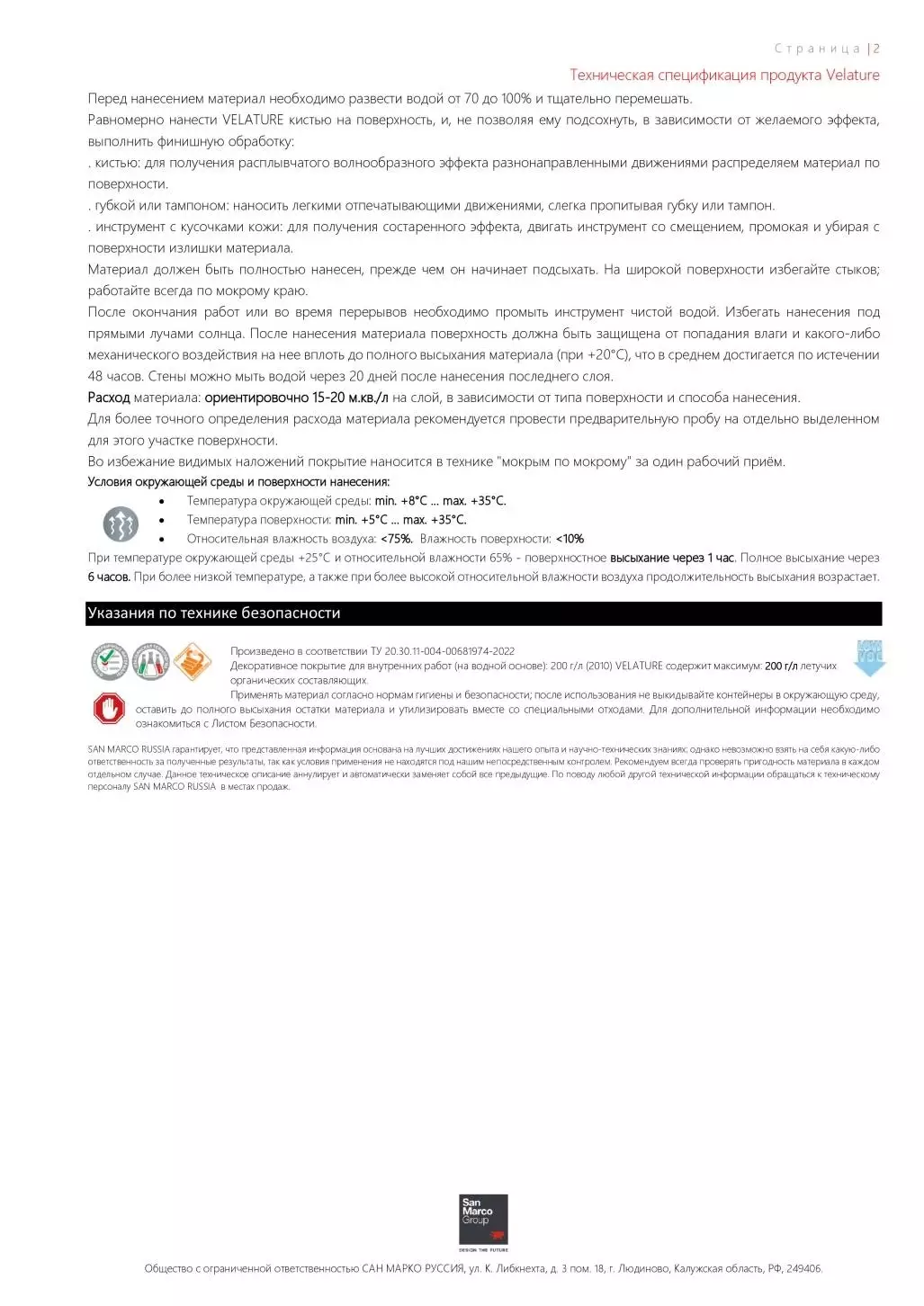 Перед нанесением материал необходимо развести водой от 70 до 100% и тщательно перемешать. Равномерно нанести VELATURE кистью на поверхность, и, не позволяя ему подсохнуть, в зависимости от желаемого эффекта, выполнить финишную обработку: . кистью: для получения расплывчатого волнообразного эффекта разнонаправленными движениями распределяем материал по поверхности. . губкой или тампоном: наносить легкими отпечатывающими движениями, слегка пропитывая губку или тампон. . инструмент с кусочками кожи: для получения состаренного эффекта, двигать инструмент со смещением, промокая и убирая с поверхности излишки материала. Материал должен быть полностью нанесен, прежде чем он начинает подсыхать. На широкой поверхности избегайте стыков; работайте всегда по мокрому краю. После окончания работ или во время перерывов необходимо промыть инструмент чистой водой. Избегать нанесения под прямыми лучами солнца. После нанесения материала поверхность должна быть защищена от попадания влаги и какого-либо механического воздействия на нее вплоть до полного высыхания материала (при +20°C), что в среднем достигается по истечении 48 часов. Стены можно мыть водой через 20 дней после нанесения последнего слоя.