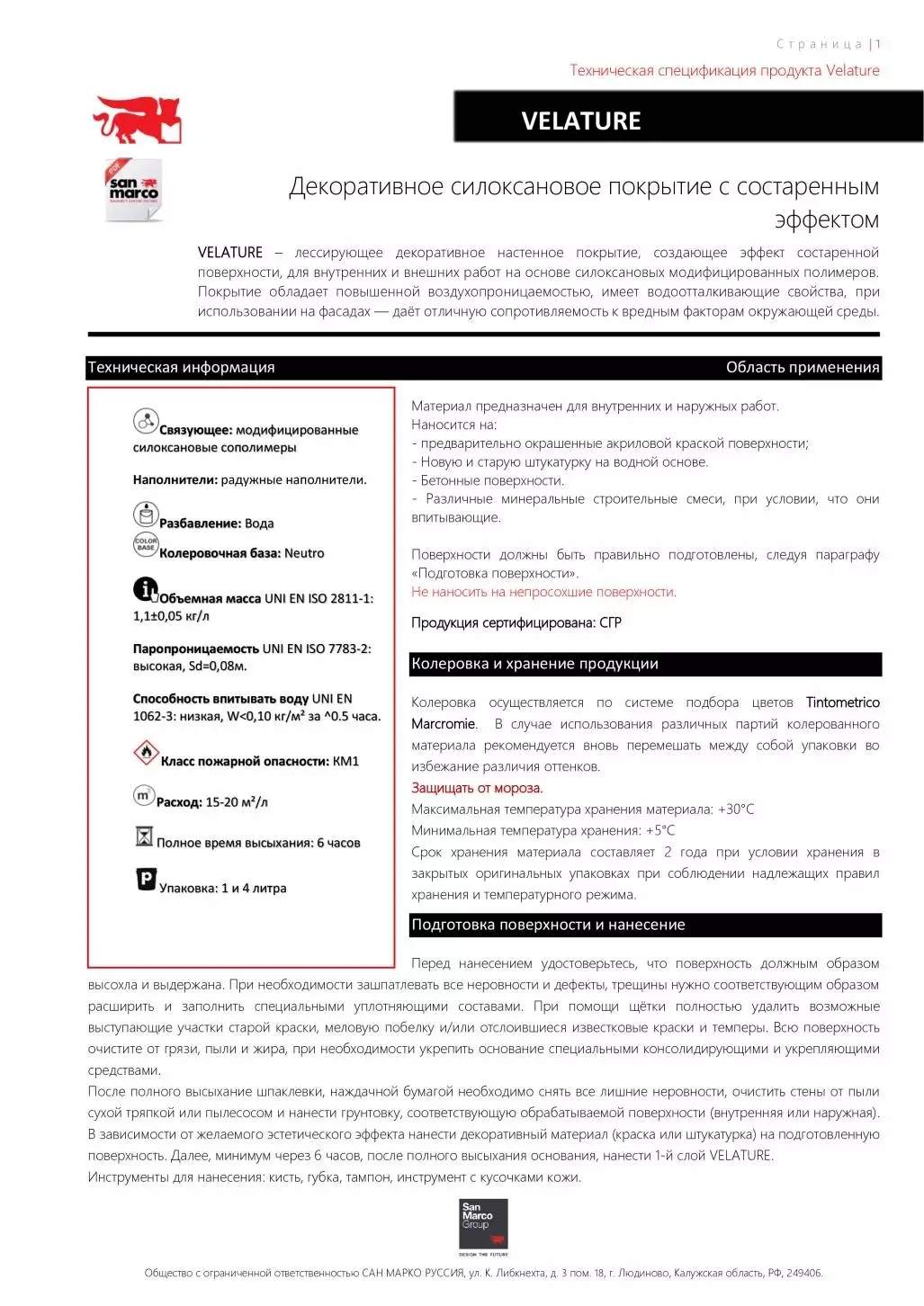 Колеровка осуществляется по системе подбора цветов Tintometrico Marcromie. В случае использования различных партий колерованного материала рекомендуется вновь перемешать между собой упаковки во избежание различия оттенков. Защищать от мороза. Максимальная температура хранения материала: +30°C Минимальная температура хранения: +5°C Срок хранения материала составляет 2 года при условии хранения в закрытых оригинальных упаковках при соблюдении надлежащих правил хранения и температурного режима.