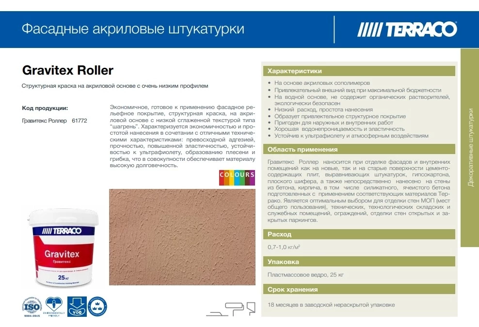 Gravitex Roller – готовое к применению покрытие на акриловой основе в виде структурной краски с низкой сглаженной текстурой типа - “шагрень”. Материал относится к бюджетной линейке акриловых текстурных штукатурок Террако, что обеспечивает сочетание высокой декоративности с экономичностью отделки. Получаемое покрытие обладает: высокой адгезией, прочностью, гибкостью, устойчивостью к ультрафиолету, образованию плесени и грибка, что обеспечивает материалу высокую долговечность. Выпускается в белом цвете или в базе для самостоятельной колеровки.