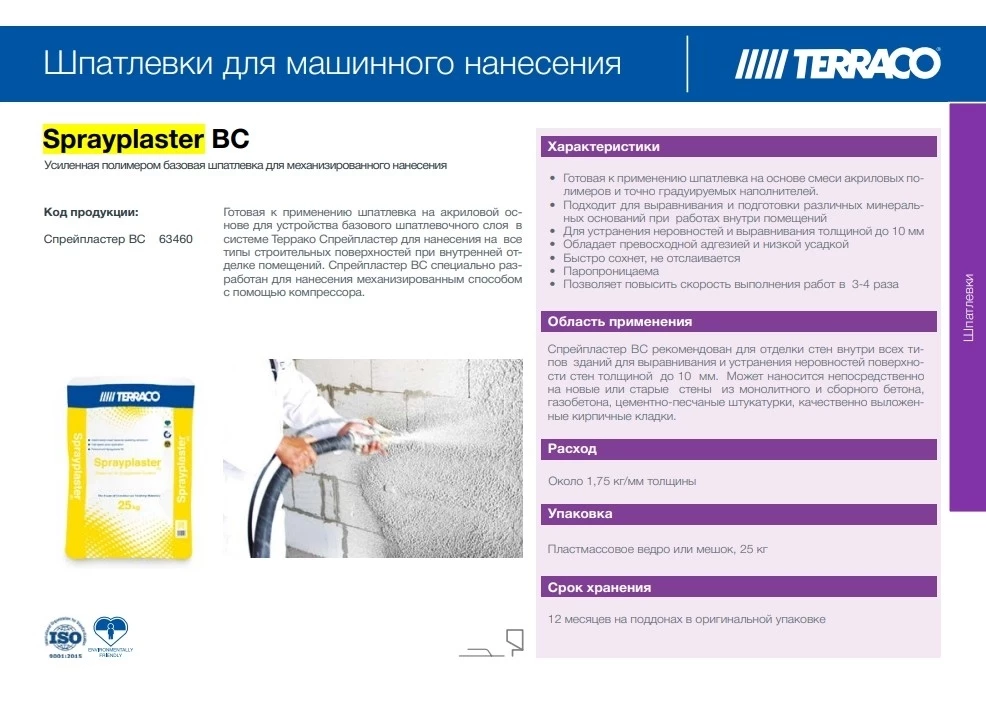 Sprayplaster ВС - базовая шпатлевка на акриловой основе для выравнивания оснований в помещениях перед финишной подготовкой. Sprayplaster BC является базовым компонентом системы Terraco Sprayplaster и предназначен для нанесения механизированным способом с использованием специального оборудования.