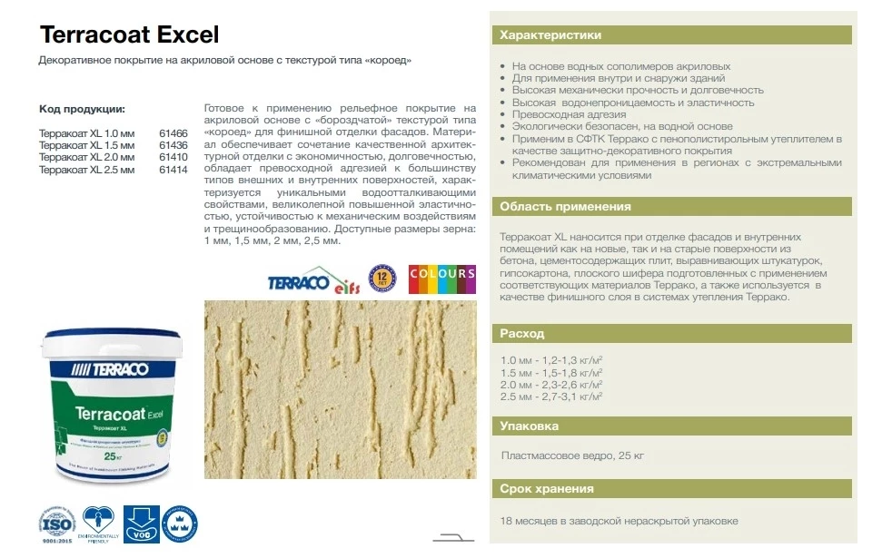 Terracoat Excel - это готовое к применению финишное декоративное штукатурное покрытие на акриловой основе с бороздчатой текстурой типа «короед». Материал обеспечивает уникальное сочетание качественной архитектурной отделки с экономичностью, высоким декоративным эффектом и долговечностью, обладает хорошей адгезией к большинству типов внешних и внутренних поверхностей, характеризуется прекрасными водоотталкивающими свойствами, эластичностью, устойчивостью к механическим воздействиям и трещинообразованию. Материал предлагается в виде 4 фракций: 1,0, 1,5, 2,0, 2,5 мм.