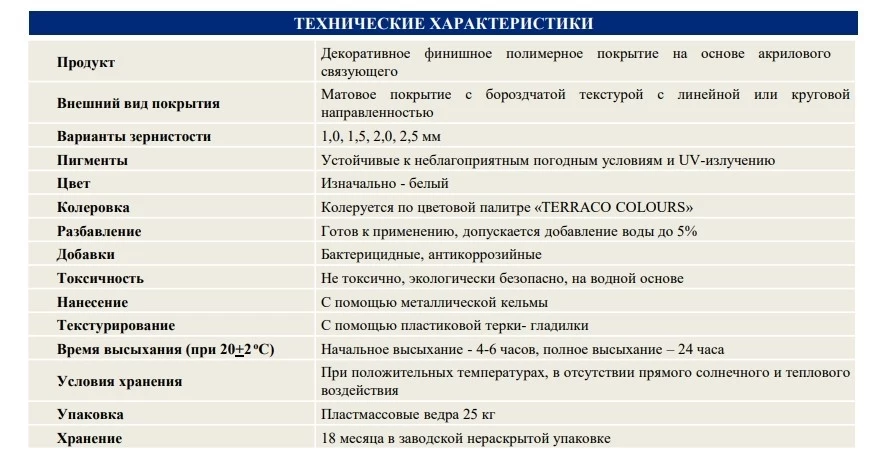 Перед работой материал необходимо тщательно перемешать с помощью низкооборотного миксера. При необходимости, довести покрытие до требуемой консистенцию добавлением небольшого количества воды. Материал наносится на основание с помощью нержавеющей кельмы слоем толщиной в «одно зерно», Для получения внешнего вида покрытия, нанесенный Terracoat Excel равномерно разравнивается по поверхности основания, а затем аккуратно затирается с помощью пластиковой гладилки для получения на поверхности борозд линейной или круговой направленности в зависимости от желаемого текстурного рисунка. Во избежание сухих краев, нанесение Terracoat Excel следует производить без остановок от одного края поверхности до другого, стыкуя рабочие захватки по принципу «мокрый по мокрому». Окончательный внешний вид текстуры нанесенного покрытия формируется после высыхания. Нанесение Terracoat Excel допускается выполнять в сухих условиях при относительной влажности не более 80% и температурах основания и окружающей среды +5- +30 оС. Низкие температуры и высокая влажность могут существенно увеличивать время окончательного твердения и высыхания покрытия. Время начального высыхания нанесенного материала при нормальных условиях составляет около 5-6 часов. Время полного высыхания-24 часа. После работы инструменты вымыть водой. Для исключения различий в оттенках материала на отдельно взятой поверхности следует использовать материалы, относящиеся к одной партии выпуска. При дозаказе материала того же цвета рекомендуется указывать номер партии материала и дату его производства, которые указываются на упаковке.