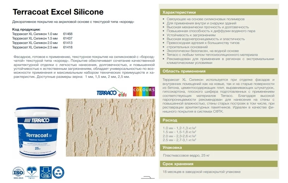 Terracoat Silicone Excel - готовое к применению финишное декоративное штукатурное покрытие на основе силиконового связующего с бороздчатой текстурой типа “короед”. Материал обеспечивает сочетание качественной архитектурной отделки с легкостью нанесения и долговечностью, обладает универсальностью по возможности применения и максимальным набором технических преимуществ и характеристик. Материал предлагается в виде 4 фракций:1.0, 1.5, 2.0, 2.5 мм