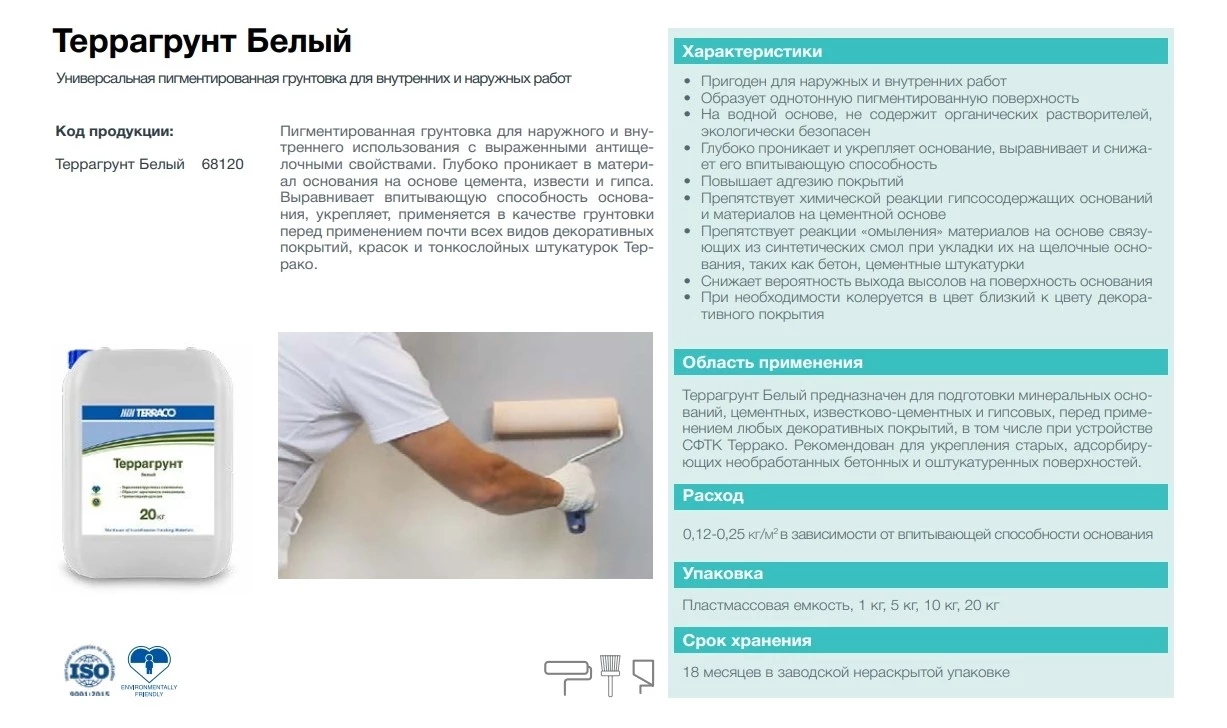 Террагрунт Белый предназначен для подготовки минеральных оснований, цементных, известково-цементных и гипсовых, перед применением любых декоративных покрытий, в том числе при устройстве СФТК Террако. Рекомендован для укрепления старых, адсорбирующих необработанных бетонных и оштукатуренных поверхностей.