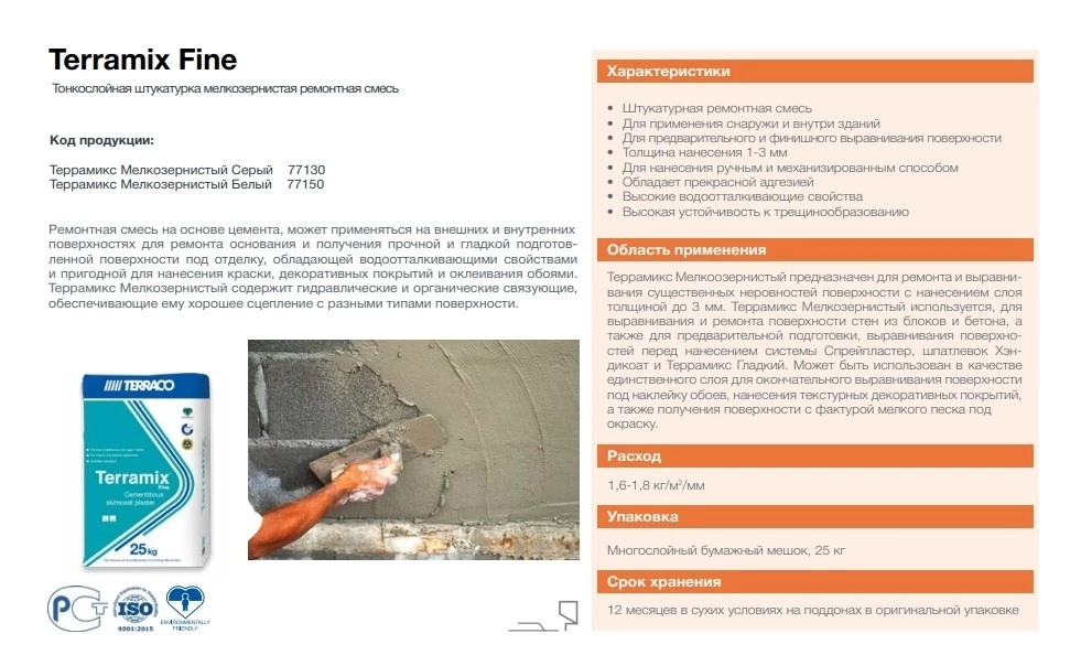 Terramix Fine используется, для выравнивания и ремонта поверхности стен из блоков и различных видов бетона, ранее нанесенных штукатурных слоев для подготовки (выравнивания) поверхностей перед нанесением шпаклёвочных составов Sprayplaster, Handycoat, а также Terramix Smooth