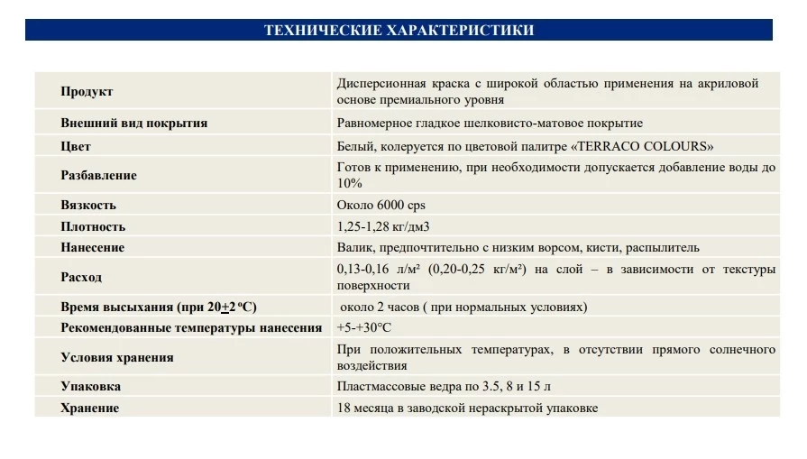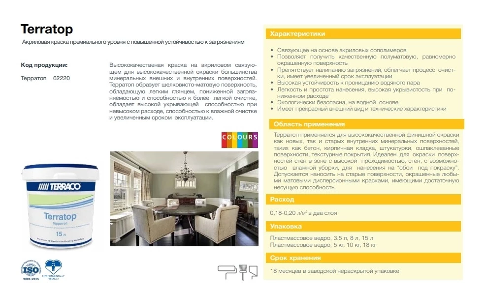 Terratop – высококачественная шелковисто - матовая краска премиального уровня. Для сухих и влажных помещений, на акриловом связующем. Подходит для нанесения на большинство минеральных оснований. Terratop обладает: высокой устойчивостью к истиранию, лучшей способностью к очищению и лучшей стойкостью к образованию “эффекта письма”. Высокая укрывающей способностью при невысоком расходе.