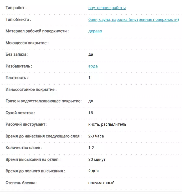 Применяется для обработки стен и потолков в парильне, душевой и раздевалке бани. Не применять для обработки полков бани.