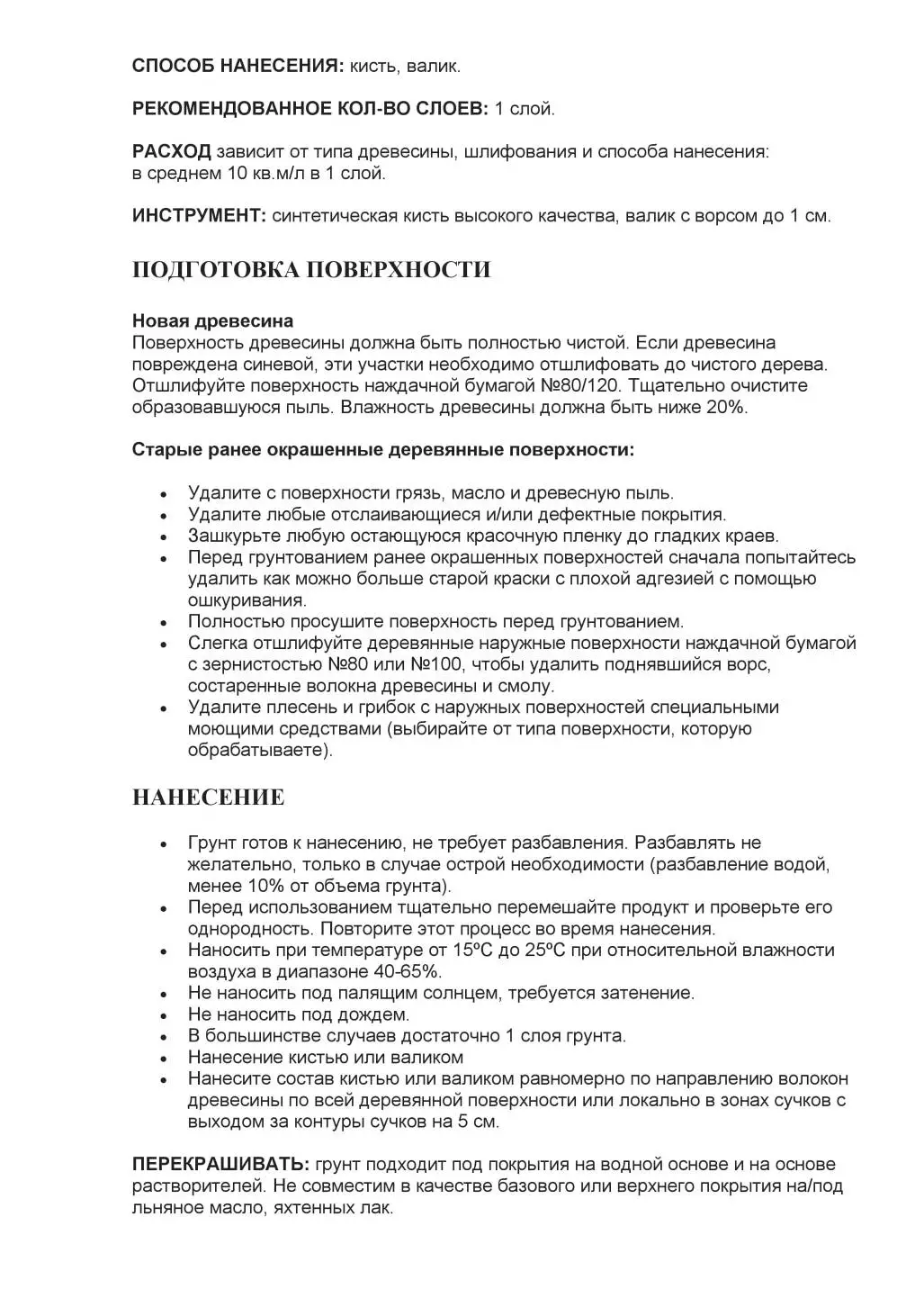 Ограничение: не подходит для напольных покрытий, не совместим в качестве базового или верхнего покрытия на/под льняное масло, яхтенных лак.