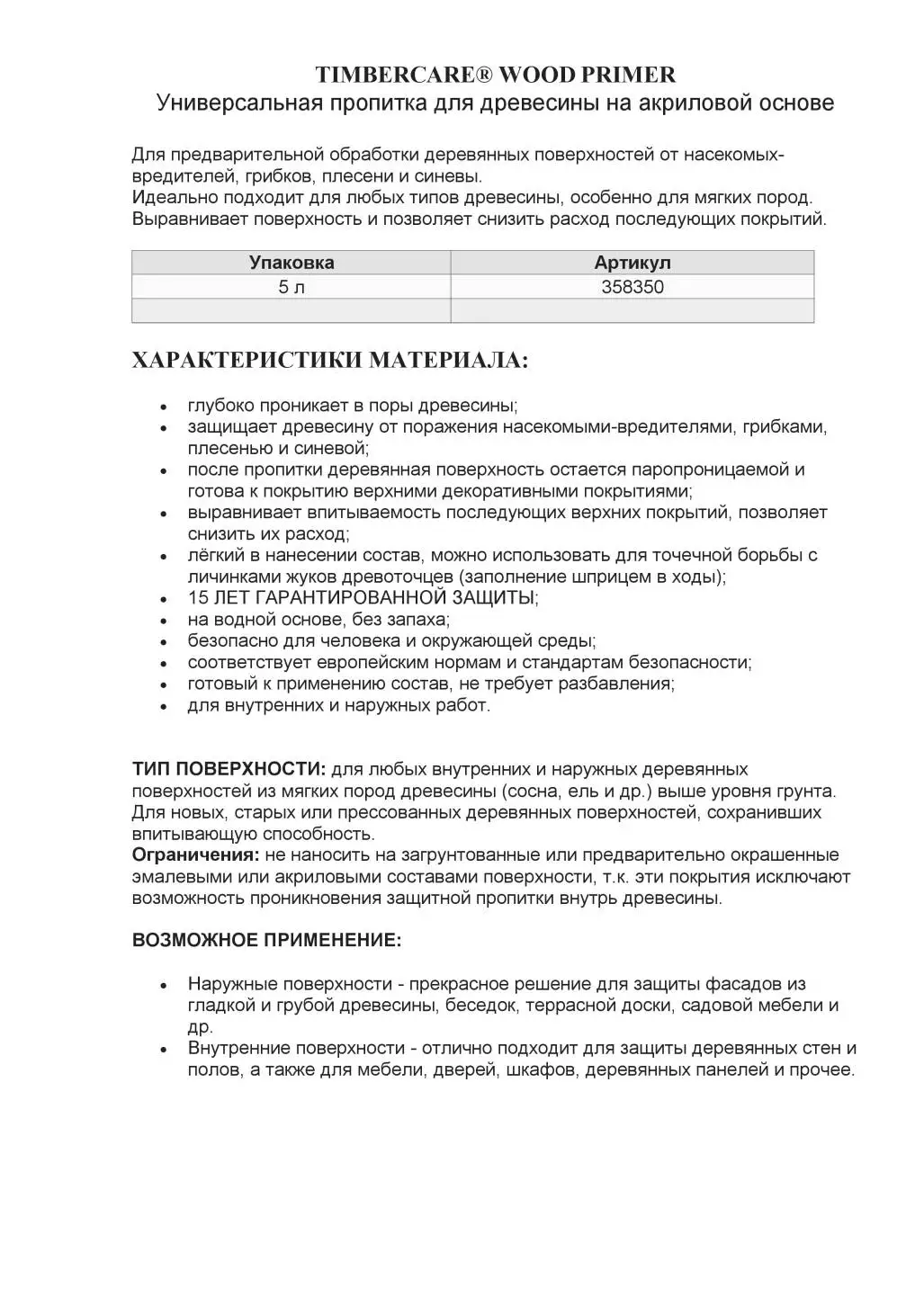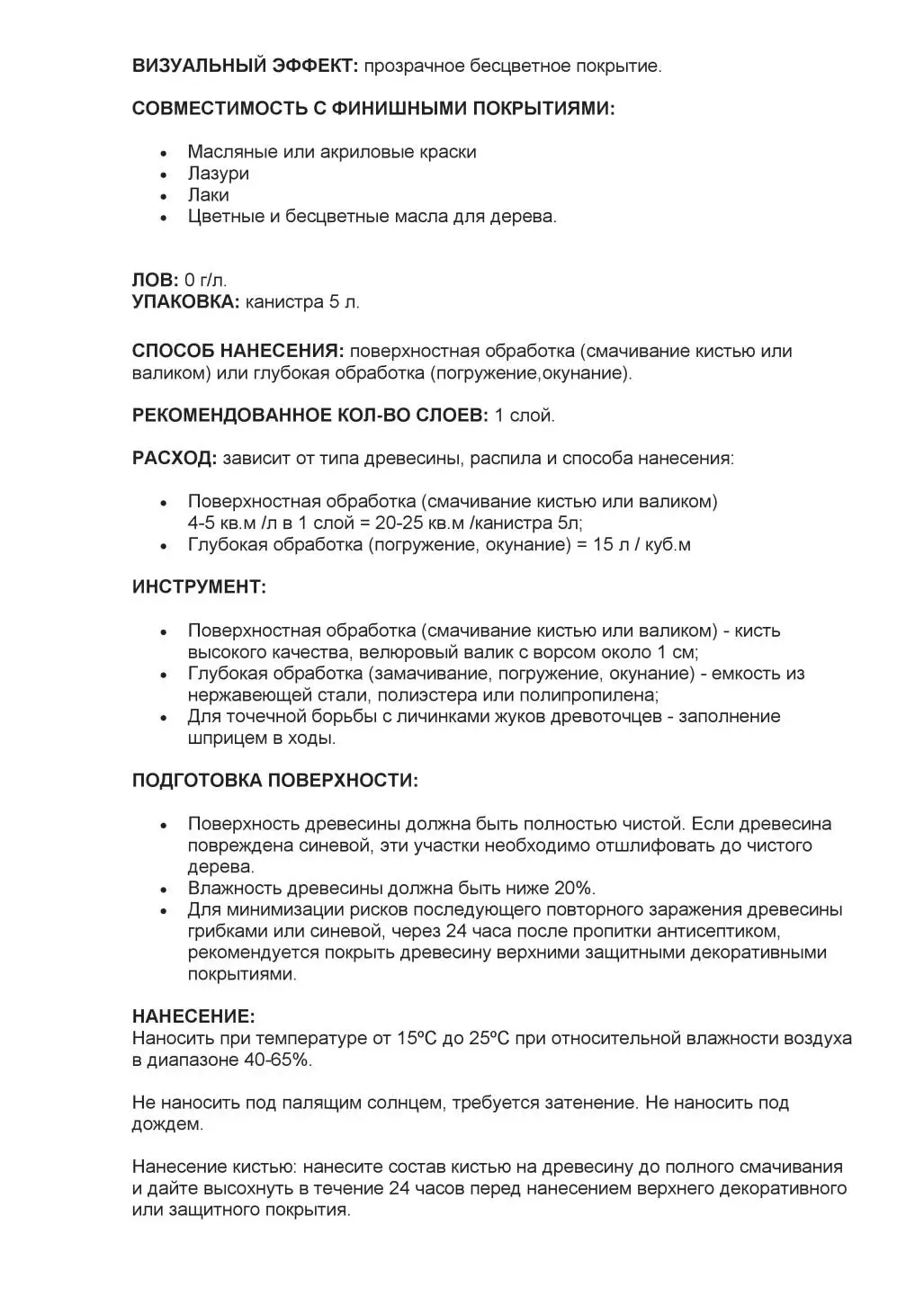 Для любых внутренних и наружных деревянных поверхностей из мягких пород древесины (сосна, ель и др.) выше уровня грунта. Для новых, старых или прессованных деревянных поверхностей, сохранивших впитывающую способность.