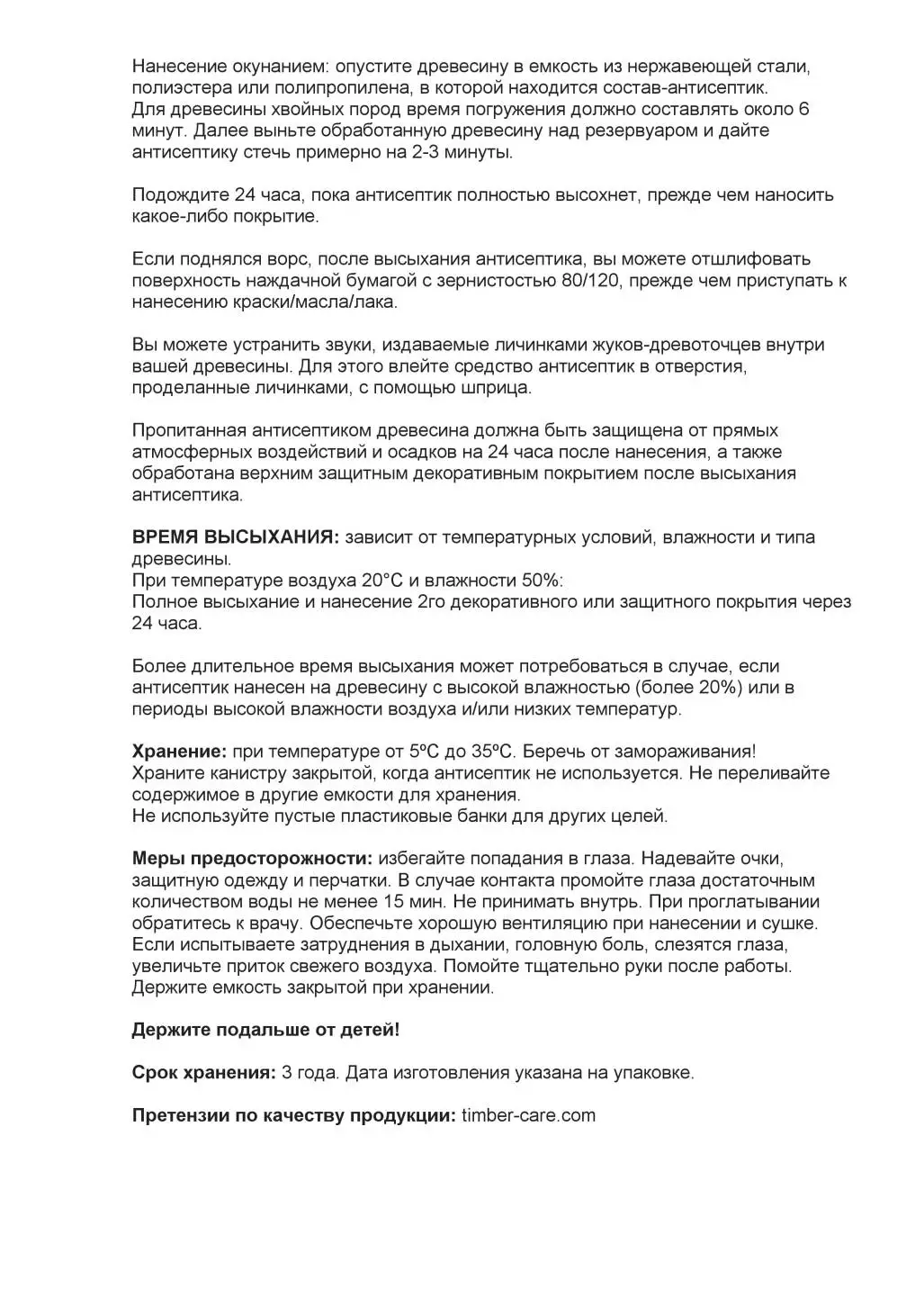 Более длительное время высыхания может потребоваться в случае, если антисептик нанесен на древесину с высокой влажностью (более 20%) или в периоды высокой влажности воздуха и/или низких температур.