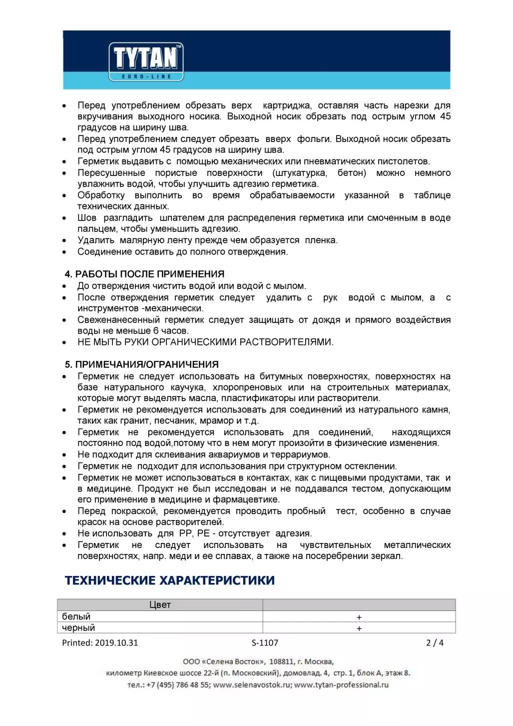 Перед употреблением обрезать верх картриджа, оставляя часть нарезки для вкручивания выходного носика. Выходной носик обрезать под острым углом 45 градусов на ширину шва. Перед употреблением следует обрезать вверх фольги. Выходной носик обрезать под острым углом 45 градусов на ширину шва. Герметик выдавить с помощью механических или пневматических пистолетов. Пересушенные пористые поверхности (штукатурка, бетон) можно немного увлажнить водой, чтобы улучшить адгезию герметика. Обработку выполнить во время обрабатываемости указанной в таблице технических данных. Шов разгладить шпателем для распределения герметика или смоченным в воде пальцем, чтобы уменьшить адгезию. Удалить малярную ленту прежде чем образуется пленка. Соединение оставить до полного отверждения.