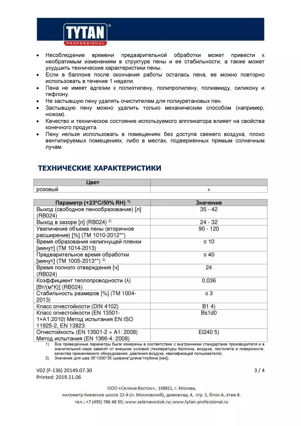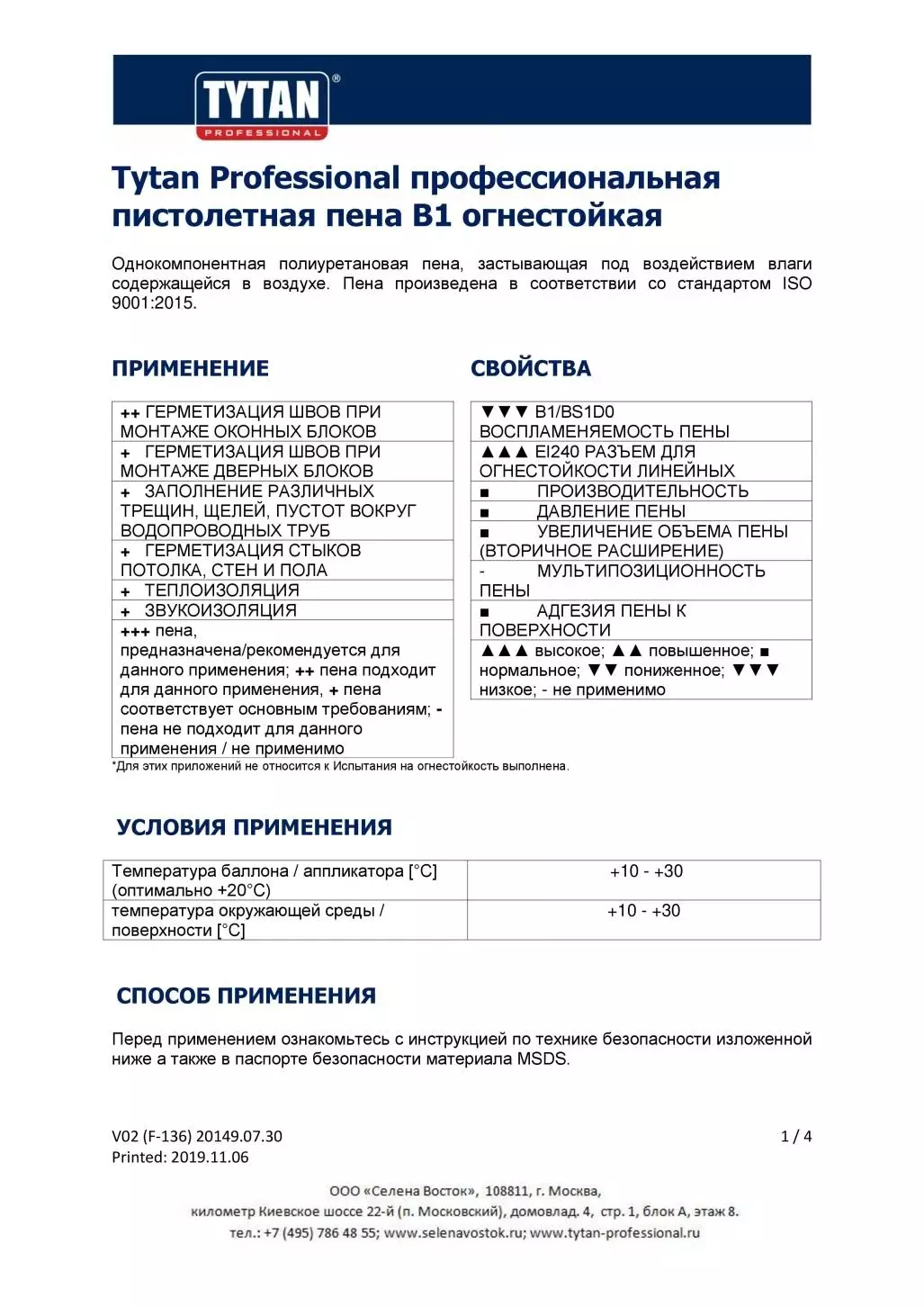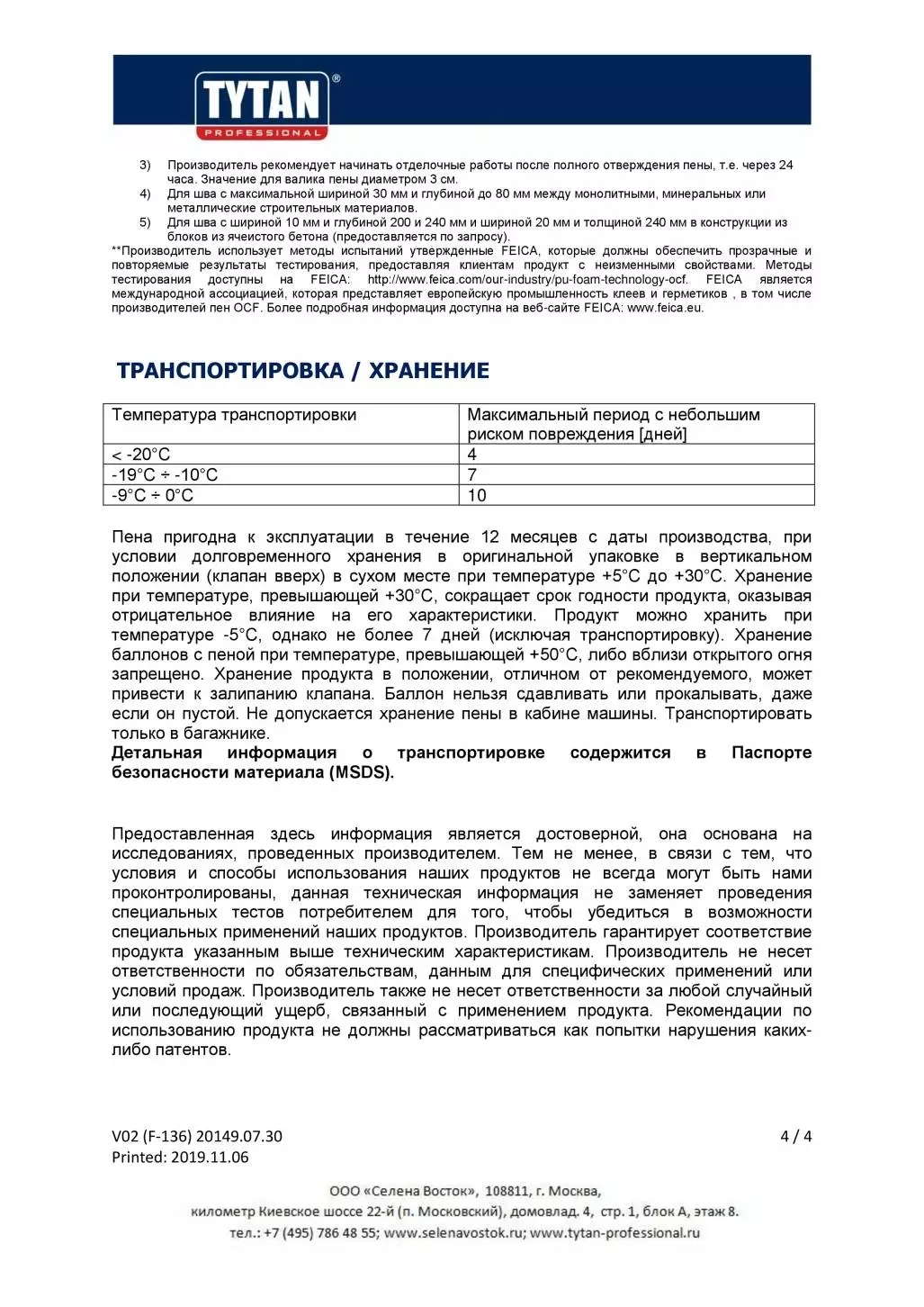 Пена пригодна к эксплуатации в течение 12 месяцев с даты производства, при условии долговременного хранения в оригинальной упаковке в вертикальном положении (клапан вверх) в сухом месте при температуре +5°C до +30°C. Хранение при температуре, превышающей +30°C, сокращает срок годности продукта, оказывая отрицательное влияние на его характеристики. Продукт можно хранить при температуре -5°C, однако не более 7 дней (исключая транспортировку). Хранение баллонов с пеной при температуре, превышающей +50°C, либо вблизи открытого огня запрещено. Хранение продукта в положении, отличном от рекомендуемого, может привести к залипанию клапана. Баллон нельзя сдавливать или прокалывать, даже если он пустой. Не допускается хранение пены в кабине машины. Транспортировать только в багажнике.