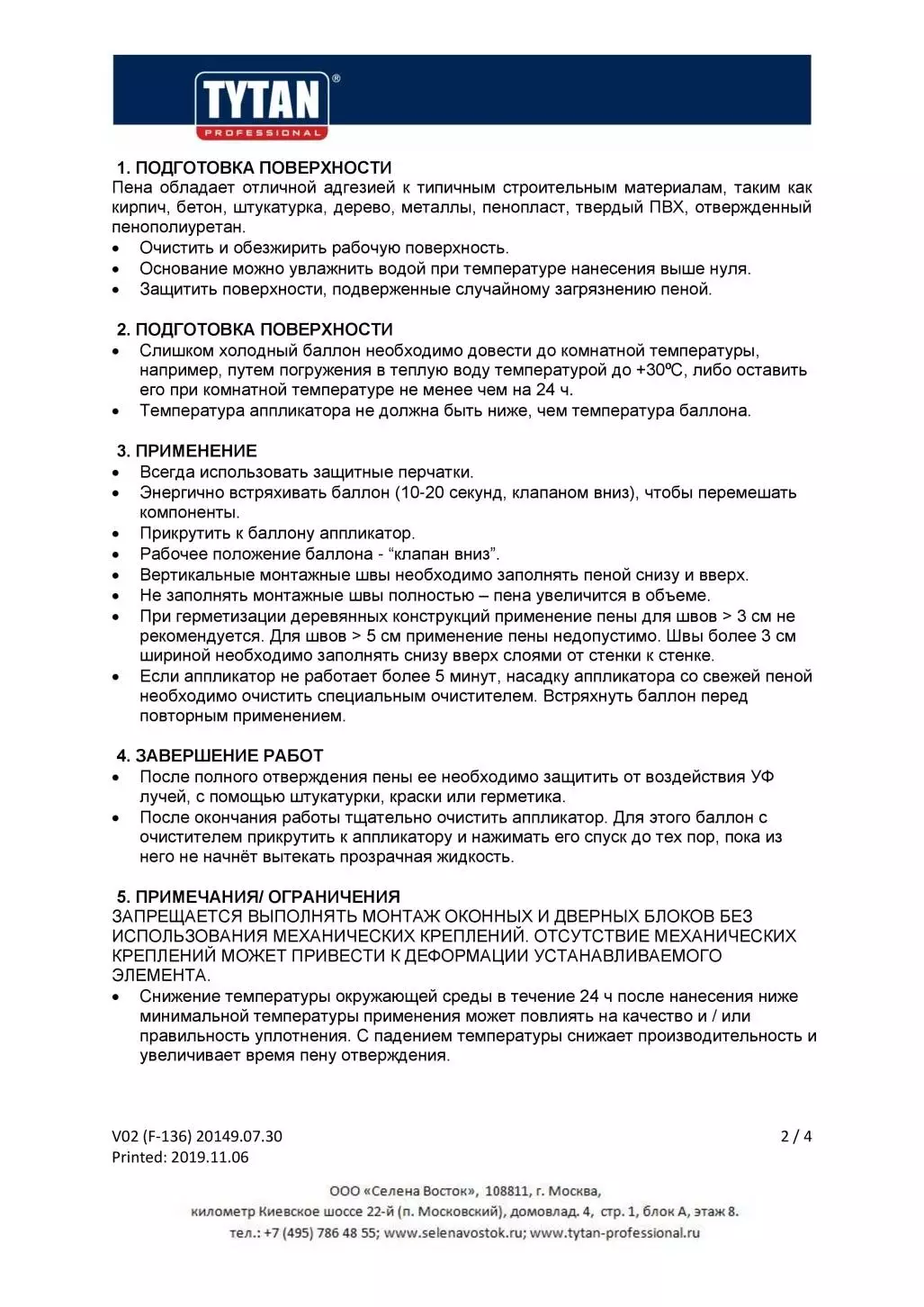 Всегда использовать защитные перчатки. Энергично встряхивать баллон (10-20 секунд, клапаном вниз), чтобы перемешать компоненты. Прикрутить к баллону аппликатор. Рабочее положение баллона - “клапан вниз”. Вертикальные монтажные швы необходимо заполнять пеной снизу и вверх. Не заполнять монтажные швы полностью – пена увеличится в объеме. При герметизации деревянных конструкций применение пены для швов > 3 см не рекомендуется. Для швов > 5 см применение пены недопустимо. Швы более 3 см шириной необходимо заполнять снизу вверх слоями от стенки к стенке. Если аппликатор не работает более 5 минут, насадку аппликатора со свежей пеной необходимо очистить специальным очистителем. Встряхнуть баллон перед повторным применением.