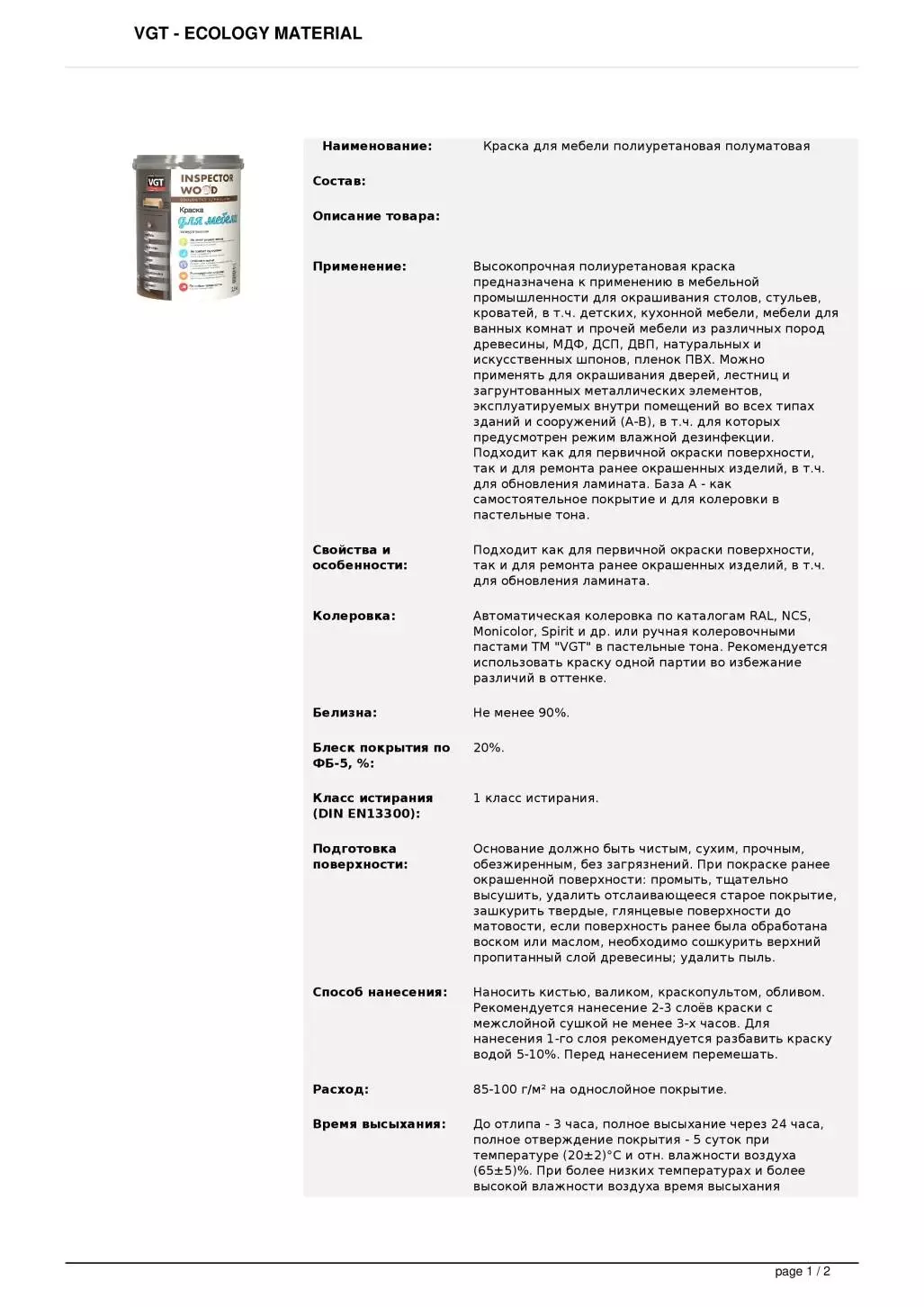 Высокопрочная полиуретановая краска предназначена к применению в мебельной промышленности для окрашивания столов, стульев, кроватей, в т.ч. детских, кухонной мебели, мебели для ванных комнат и прочей мебели. Можно применять для окрашивания дверей, лестниц и загрунтованных металлических элементов, эксплуатируемых внутри помещений во всех типах зданий и сооружений (А-В), в т.ч. для которых предусмотрен режим влажной дезинфекции.